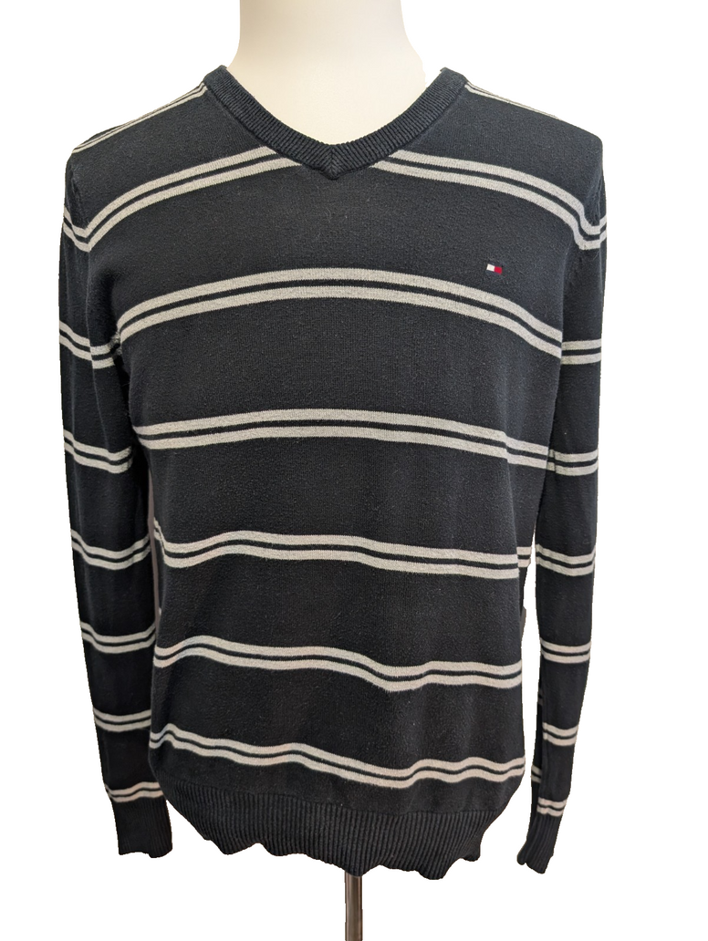 Magnifique pull col V Tommy Hilfiger. Modèle noir à fines rayures grises, maille de qualité et finitions soignées. Article en excellent état, idéal pour toutes les saisons.
