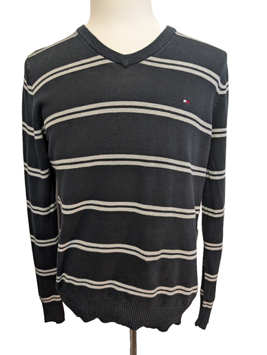 Pull Tommy Hilfiger Homme Col V Noir Rayé Gris Logo Brodé - Taille M